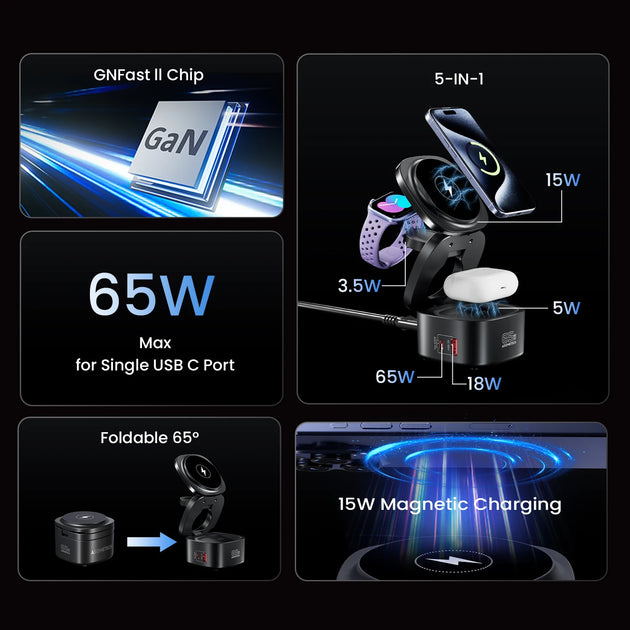 65W Magnetic 5-in-1 Foldable Wireless Fast Charger Station